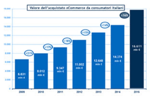 Prosegue la crescita dell'eCommerce in Italia: il valore degli acquisti online degli italiani raggiunge nel 2015 i 16,6 miliardi di euro con un incremento in valore del 16% rispetto al 2014 pari a oltre 2,2 miliardi di euro.