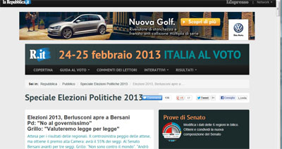 Risultato senza precedenti per Repubblica.it: nel giorno dello spoglio elettorale, il sito del Gruppo Espresso ha avuto 5,5 milioni di lettori, con 87 milioni di pagine e 9,8 milioni di sessioni. Un risultato che rafforza la leadership assoluta del sito del quotidiano diretto da Ezio Mauro nel campo delle news.