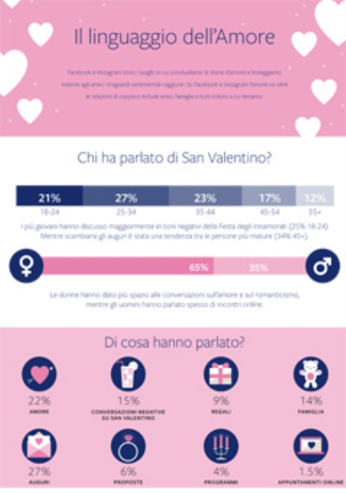 Nel periodo considerato, i post condivisi sono aumentati del 18% e le foto del 24% registrando una crescita anno su anno delle conversazioni dedicate a San Valentino pari al +372%.