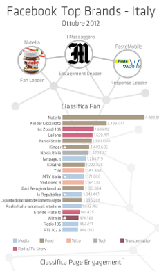 Nella classifica dei brand con più fan Nutella continua ad essere quello con più seguito in Italia. Molto dinamico il ranking delle pagine più coinvolgenti con tre quotidiani che competono per la leadership e tanti brand in ascesa. Infine la classifica per tempi di risposta vede ancora una volta brillare il marchio di PosteMobile.