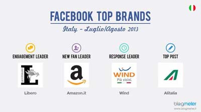 La pagina più performante durante i mesi di luglio e agosto è stata quella di Amazon.it che guadagnando ben 450mila nuovi fan ha superato abbondantemente quota 2 milioni di fan complessivi diventando così una delle pagine più seguite dagli italiani. Al secondo posto si situa Samsung Mobile Italia con oltre 294mila fan acquisiti. L'ascesa della casa coreana produttrice di device hi-tech è sottolineata anche dal quarto posto ottenuto dalla pagina di Samsung Italia. Il quotidiano online Fanpage.it occupa invece la terza posizione grazie all'acquisizione di oltre 215mila nuovi fan durante l'estate. In questo modo raggiungendo 1,96 milioni di fan italiani a fine agosto si attesta come la pagina Facebook più seguita nella categoria dei media oltre a essere quella che ha registrato, nei due mesi oggetto di analisi, il maggior numero di interazioni complessive: oltre 2,1 milioni di attività degli utenti tra post, commenti, like e condivisioni.
