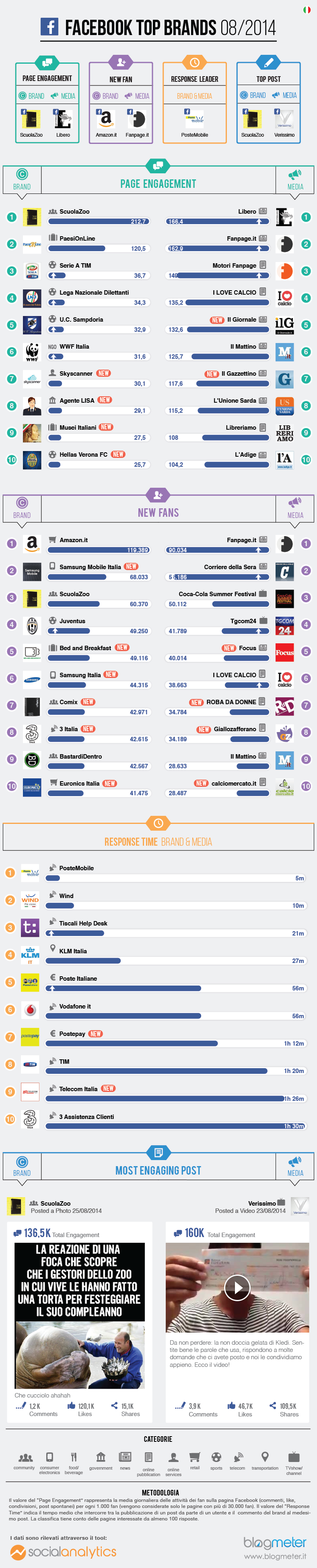 Durante il mese di agosto Blogmeter ha analizzato, attraverso il tool proprietario di Social Analytics , più di 106 milioni di interazioni su oltre 2.900 pagine al fine di redigere la classifica delle migliori aziende su Facebook che si rivolgono ad un pubblico italiano.