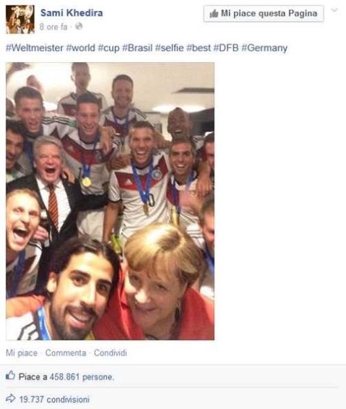 Su Facebook esplode la gioia per la vittoria dei giocatori Lukas Podolski e Sami Khedira che postano un selfie con Angela Merkel e ottengono oltre 1 milione di like. Presenti allo stadio anche Ricardo Kakà, che condivide uno scatto con Pelé raggiungendo 909.638 di like, e David Beckham felice allo stadio con i suoi 3 figli per la prima finale tutti assieme che vede oltre 2 milioni di like e 36.604 condivisioni.