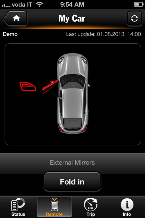 La sezione My Car consente di visualizzare tutte le informazioni relative al percorso dell’auto, sia quello attuale che a tutti quelli effettuati dall’inizio. I dati disponibili sono: la distanza effettuata, la velocità media, il tempo di guida ed il consumo medio. Anche la pressione dei pneumatici, così come lo stato (aperto / chiuso) di porte, finestre, cofano e bagagliaio sono sempre visualizzabili in tempo reale.