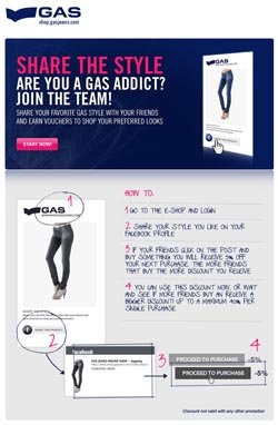 A partire dal 15 febbraio GAS è online con Share the Style, un'iniziativa creata per tutti i fan del brand.Entrando nell’e-shop www.shop.gasjeans.com e condividendo i propri capi o look preferiti su Facebook, tutti i GAS e-lovers potranno guadagnarsi opportunità di acquisto. Infatti, per ogni amico che cliccherà sul post ed effettuerà un acquisto, la persona che ha pubblicato il suo look preferito riceverà un buono del 5% sulla sua prossima spesa. Più amici acquisteranno sul sito e più crescerà il valore del voucher, fino ad un massimo del 40% sul singolo acquisto.