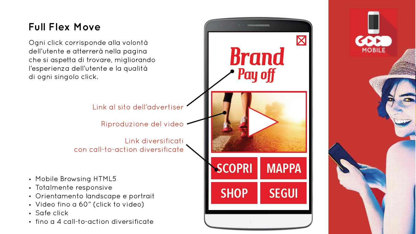 Guardando ai formati proposti, va sottolineato innanzitutto che il Programmatic buying può essere applicato a tutti i formati, compresi quelli più complessi o inusuali. A formati display d'impatto (Good Impact), pensati anche per favorire la viewability, si affiancano formati mobile innovativi (Good Mobile) come ad esempio il Full Flex Mode, che consente di entrare in contatto con il brand in modo molto intuitivo (vedi immagine allegata). C'è poi la possibilità di utilizzare il meteo planning, erogando campagne in base alle condizioni meteo, o di optare per il geo-cultural planning.
