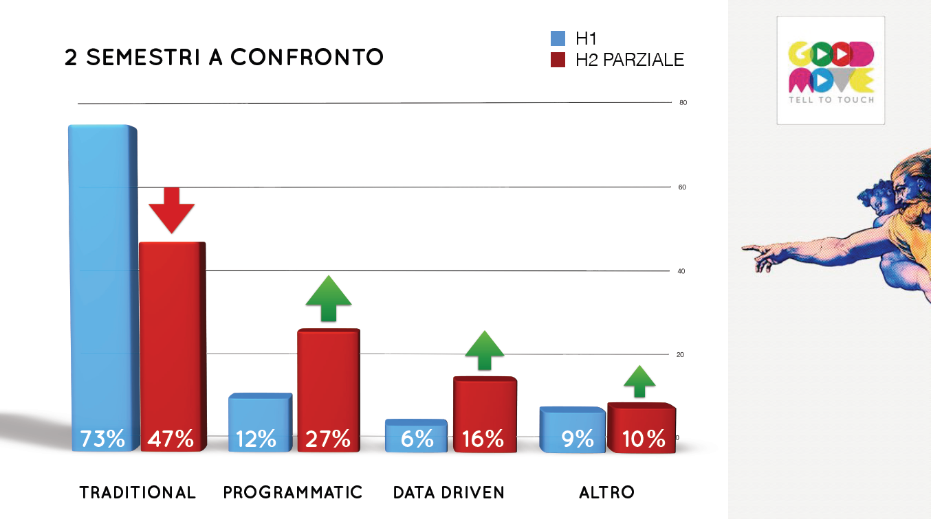 p"I progetti speciali attualmente rappresentano il 10% del nostro business, mentre la percentuale relativa al programmatic è pari al 27% (vedi grafico allegato) - ha dichiarato Vimini - . Considerata la crescita di quest'area nell'ultimo semestre (la percentuale è passata dal 14 al 27%, ndr.), contiamo di riuscire nel corso del prossimo anno a raggiungere il 40%, registrando al contempo anche un aumento delle campagne data-driven, che attualmente 'valgono' il 16%".