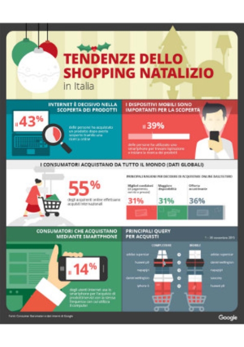 Secondo il Consumer Barometer di Google, il digitale diventa sempre più spesso la porta d’accesso ai regali di Natale. Crescono le ricerche da dispositivi mobili per lo shopping natalizio Il 43% degli italiani ha acquistato un prodotto dopo averlo scoperto sul web. Il web diventa quindi una risorsa fondamentale per le aziende, non solo per la vendita online, ma anche per l’awareness di prodotto e per a consultazione in tempo reale dentro al negozio. Nel mondo, le ricerche da mobile legate agli acquisti natalizi sono cresciute del 120% rispetto all’anno scorso. In aumento l’m-commerce:ill 14% degli utenti internet usa lo smartphone per l’ acquisto di prodotti o servizi con la stessa frequenza con cui utilizza il computer .