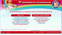 sull’invio via sms di un codice univoco contenuto nelle confezioni: l’utente riceve immediatamente la notifica dell’avvenuta vincita del premio in palio, uno dei 100 set di Spugna Bassetti o una delle 10 lavatrici Indesit Energy Saver. In caso contrario al cliente viene inviato un nuovo codice da inserire sul sito promozionale www.10anniacchiappacolore.it per partecipare, dopo breve profilazione, all’estrazione del superpremio consistente in 10 anni di energia elettrica, corrisposti in monete d’oro.I punti vendita sono stati coinvolti invece con la distribuzione di cartoline “gratta e vinci”: ad ogni acquisto di due prodotti della linea per la cura del bucato si ottiene una cartolina per tentare la fortuna. Per aumentare le possibilità di vincita basta visitare il sito www.10anniacchiappacolore.it, compilare una breve profilazione e ottenere via sms una parola chiave che permette di ottenere nel punto vendita una seconda cartolina per tentare la sorte. Il meccanismo è semplicissimo: basta scoprire una patina argentata per verificare la vincita immediata di 7500 spugne e 10 lavatrici Indesit Energy Saver. Una seconda occasione di “acchiappare” la fortuna è data da un’altra striscia argentata che nasconde invece un codice univoco da inviare via SMS per partecipare all’estrazione finale di un viaggio nel Mar Rosso per due persone.