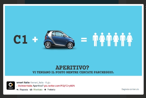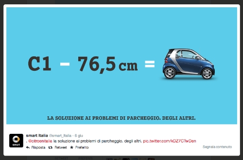 Le case history sviluppate da Endeavour in ambito social sono numerose e delle più varie. Fra queste, vi è il progetto sviluppato per smart Italia basato sull’interazione tra brand sui social network. “Si tratta di uno scambio di tweet tra smart Italia e Citröen Italia sulla formula del parcheggio perfetto - continua Lorato -, nato da una comunicazione della casa francese sulle dimensioni della nuova city car C1 che abbiamo sfruttato per rimarcare, in maniera creativa e originale, la unique selling proposition inimitabile di smart: la facilità di parcheggio” (apri la gallery fotografica per vedere le immagini della case history).