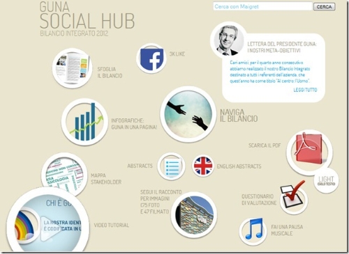 Per facilitarne la diffusione limitando l’impatto ambientale, il Bilancio è stato reso disponibile per la distribuzione solo in versione elettronica, grazie alla creazione del “Social Hub”: una piattaforma online all’indirizzo bilanciointegrato.guna.it dove l’utente potrà scegliere in libertà il proprio percorso di approfondimento del mondo GUNA.