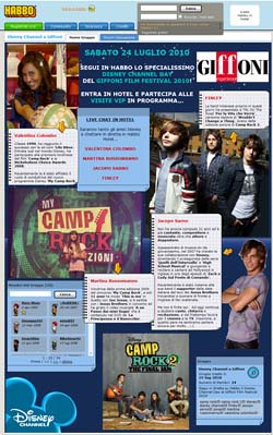 Grande successo per il Camp Rock 2 Day svoltosi nella community online di Habbo durante il Giffoni Film Festival in svolgimento in questi giorni a Giffoni Valle Piana. Habbo.it, la community online per teenager in Italia, e Disney Channel hanno infatti avviato una collaborazione in occasione del 40° anniversario del festival cinematografico per bambini e ragazzi organizzando questo speciale evento che si è tenuto sul sito di Habbo, in diretta dalla cittadina campana, con la partecipazione di tanti artisti Disney. Oltre 5000 ragazzi si sono collegati da tutta Italia sabato scorso per incontrare alcuni dei loro artisti preferiti. Molti i vip che, attraverso appositi personaggi virtuali, hanno partecipato ad una serie di chat direttamente dalla Disney Lounge Bar, una speciale stanza brandizzata all’interno di Habbo.it. Fra gli artisti che sono entrati nella community per incontrare i tanti fan e rispondere alle loro innumerevoli domande, la band milanese dei Finley. Presenti anche Valentina Colombo da 'Life Bites', Jacopo Sarno, star Disney protagonista delle serie 'Quelli dell’Intervallo' e di 'High School Musical: lo spettacolo', e infine Martina Russomanno, vincitrice della prima edizione del concorso 'My Camp Rock'.