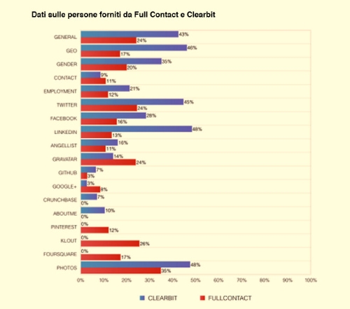 (Aprire la gallery fotografica: il primo grafico offre un confronto dei dati forniti da FullContact e Clearbit per i profili aziendali. Invece, il secondo grafico offre un confronto per i dati forniti per i profili persone).