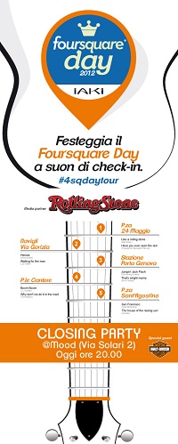 Il 16 aprile a Milano i fan della geolocalizzazione si danno al check-in per festeggiare la giornata mondiale dedicata a foursquare. Con il supporto di importanti clienti tra cui Rolling Stone e Harley-Davidson, l'agenzia ha organizzato il primo tour musicale sul Social Network dedicato alla geolocalizzazione.