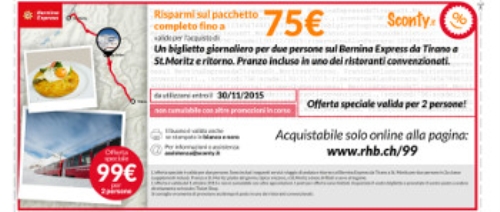 Il Trenino Rosso del Bernina , dopo il successo dello scorso anno, riconferma la sua presenza sul potente canale Travel del Coupon Network di Kiwari BuonMercato, a cui fa capo il sito proprietario Sconty.it, estendendosi ad una rete di portali come alfemminile.com, scontomaggio.com,dimmicosacerchi.it e myvoucher.biz. Il Coupon Network si relaziona con un’ampia community altamente profilata, attiva quotidianamente nel ricercare occasioni di convenienza attraverso il web ed i social network.