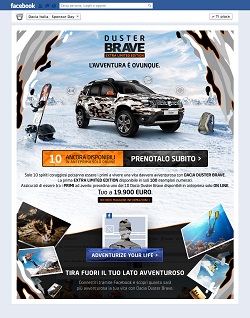 La campagna di pre-lancio firmata Publicis, evidenzia lo spirito off-road di Duster Brave con una social experience che dimostra la capacità di Duster di far vivere a chi lo guida una vita davvero avventurosa. Attraverso un’app Facebook, accessibile dal sito Dacia e dalla sua fanpage, chiunque potrà divertirsi a scoprire quanto sarebbe interessante e piena di avventura la vita di tutti i giorni con Duster Brave Extra Limited Edition.