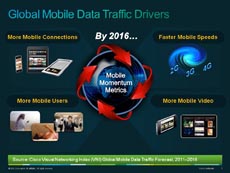 Più contenuti in streaming: a fronte delle aspettative dell’utenza consumer che richiede sempre più contenuti on-demand o in streaming rispetto al semplice download dei contenuti, il traffico cloud mobile aumenterà, crescendo di 28 volte dal 2011 al 2016, ad un tasso CAGR del 95%. Più connessioni mobile: nel 2016, i dispositivi Internet mobile connessi saranno più di 10 miliardi, inclusi i moduli M2M (machine-to-machine) - superando la stima della popolazione mondiale pari a 7,3 miliardi. Un’applicazione M2M può ad esempio essere l’utilizzo delle reti wireless per aggiornare i cartelloni digitali. Ciò permette ai pubblicitari di mostrare diversi messaggi su base giornaliera o una volta alla settimana, e permette di modificare velocemente i messaggi, come ad esempio il cambio del prezzo della benzina.