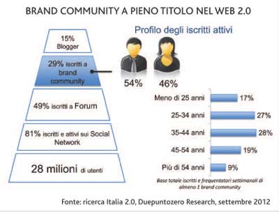 Investire in brand community conviene alle aziende. In Italia sono circa otto milioni gli utenti che partecipano a community legate ad aziende, con un milione e mezzo di loro che le utilizza quotidianamente. È quanto emerge da un ricerca condotta da Duepuntozero Research e Connexia, presentata nell’ambito della Social Media Week (settembre 2012) in occasione dell’evento ‘Macro-trend 2013: sempre più brand community. La gestione delle relazioni digitali per innovare i brand attraverso processi di co-creazione’.