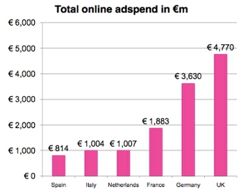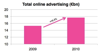 Secondo i dati AdEx di IAB Europe, gli investimenti pubblicitari online nel 2010 ammontavano complessivamente a 17,7 miliardi di euro, in crescita del +15,3% rispetto al 2009, grazie soprattutto all’ottima performance del display (+21,3%). L’Italia è al quinto posto fra i 25 paesi analizzati da IAB Europe per valore assoluto, ma conferma la sua debolezza in termini di share sul totale investimenti media, non entrando nella Top 10.