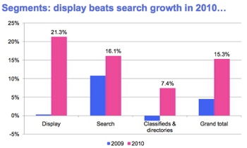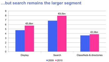 Segnando un +21,3%, il Display è la categoria dalla più rapida crescita nel 2010. Ricordato che lo scorso anno era cresciuto appena del +0,3%, Letang legge nella diffusione del video online (soprattutto, grazie al broadband, di lunga durata), del mobile e dei social media il driver principale di questo vero e proprio boom. Gli investimenti nel formato video sono praticamente raddoppiati in quasi tutti i paesi: in Spagna sono cresciuti del +125% fino a un valore totale di 13 milioni di euro, mentre in Grand Bretagna (+90%) hanno raggiunto quota 63 milioni.
