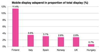 Per la prima volta, la ricerca AdEx comprende alcuni dati sulla mobile search e sul mobile display, anche se relativi solo a 12 dei 25 paesi aderenti a IAB Europe. In generale, l’osservazione degli analisti è che il mercato abbia comunque cominciato ad acquistare una sua fisionomia grazie all’avvento e allo sviluppo dell’ecosistema composto da 3G, smartphone e Apps. Pur senza dare valori assoluti, la stima di IAB Europe è che - esclusi gli annunci via Sms - il mercato del mobile advertising abbia superato in diversi paesi la share del 2% sul totale degli investimenti online.