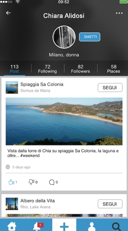 Tutti e tre i tab consentono due tipi di visualizzazione: per elenco o su mappa, in forma di pin point. Yesplace presenta inoltre due profili: il profilo del luogo, che contiene tutti i post relativi alla location prescelta, suddivisi tra recenti, popolari e miei (pubblicati dall’utente); il profilo utente, che contiene invece tutti i post pubblicati dal singolo nei vari luoghi.