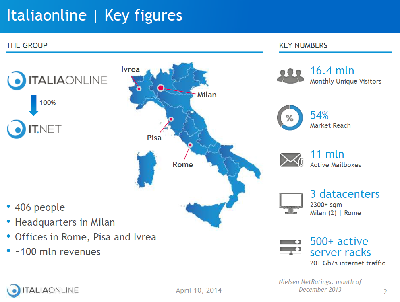 Italiaonline è la internet company italiana a cui fanno capo, tra le altre web properties, anche i portali Libero e Virgilio. Conta su un team di circa 400 persone, dislocate tra Milano, dove da un anno ha inaugurato i nuovi uffici ad Assago Milanofiori, Roma, Pisa e Ivrea. Il fatturato 2013 si è attestato a circa 100 milioni di euro, con EBITDA positivo a 23 milioni. Con un totale di 16,8 milioni di utenti unici e 2 miliardi di page views al mese, Italiaonline vanta il 54% di market reach ed è il terzo player del settore dopo Google e Facebook. Sul fronte del display e rich advertising è invece il player più rilevante nel nostro Paese, per numeri e ricavi.