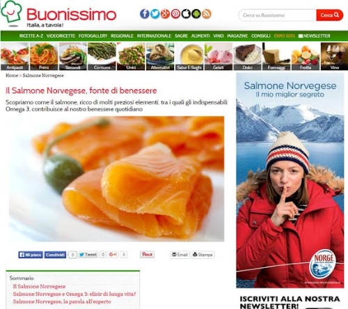 Italiaonline, internet company italiana, prosegue per il terzo anno consecutivo nel sodalizio con Norwegian Seafood Council (NORGE), l’ente parastatale che promuove e tutela i prodotti ittici norvegesi nel mondo, lanciando una sezione dedicata al salmone norvegese ospitata nel portale verticale partner Buonissimo e sviluppata in collaborazione con il centro media MEC sulla scia degli ottimi risultati raggiunti lo scorso anno, quando l’analoga sezione, presente su Buonissimo dal 22 ottobre al 28 dicembre 2014, ha totalizzato (fonte: Comscore) oltre un milione di pagine viste e 250mila utenti unici, con ben 18mila condivisioni delle ricette via Facebook.