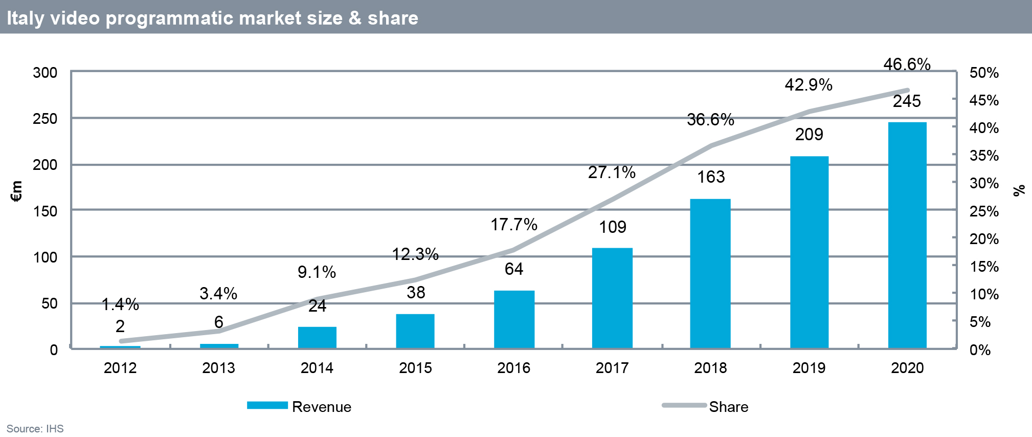 Secondo IHS, il 12% del video advertising online in Italia è negoziato con metodi programmatici nel 2015, rispetto al 23% nel Regno Unito, all'11% in Spagna e al 9% in Germania. Questo dato è appena inferiore alla media dei cinque maggiori mercati europei, pari al 15%, ma si prevede raggiungerà il 46,6% entro il 2020, grazie a un tasso di crescita annuale composto del 45%.