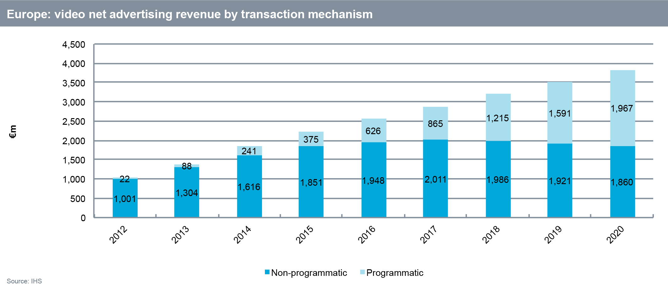 A livello europeo, il video advertising online programmatico è cresciuto di quasi venti volte dai 22 milioni di euro del 2012 ai 375 milioni di euro del 2015, e registrerà un tasso di crescita del 38,7% da qui al 2020, quando più della metà dei ricavi totali del video advertising online in Europa saranno generati dal programmatico, il cui valore complessivo arriverà a sfiorare i 2 miliardi di euro.