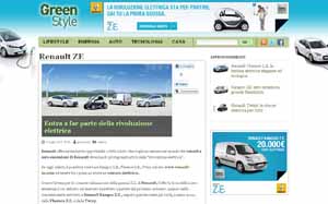 Lo speciale, raggiungibile tramite box fisso da tutte le pagine di GreenStyle e dal canale EcoAuto di Motori.it, il portale automotive del gruppo, presenta l’offerta Renault, ovvero la possibilità di prenotare in anteprima uno dei veicoli elettrici sul sito www.renault-ze.com e di poter prendere così parte alla cosiddetta “Rivoluzione elettrica”. La redazione di GreenStyle ha inoltre curato gli articoli di approfondimento focalizzati su Kangoo Z.E., Fluence Z.E. e Twizy, i tre veicoli elettrici Renault che è possibile “riservare”: gli articoli, oltre a elencare le caratteristiche tecniche dei veicoli, sono arricchiti da gallery di immagini e da un video promozionale della gamma. Completa lo speciale la customizzazione di top e background del canale, il tutto sviluppato dallo staff creativo di TAG Advertising.