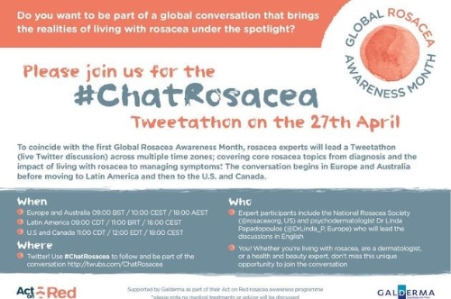 Il GRAM culmina nella prima Global Rosacea Tweetathon lunedì 27 aprile. Un team di esperti, tra cui medici, pazienti, psicologi e blogger prenderanno parte a una discussione via Twitter riguardo i principali temi relativi alla rosacea, dalla diagnosi all’impatto sulla vita quotidiana fino alle terapie per gestire la malattia.