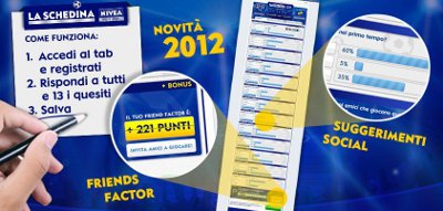 Prosegue così per il terzo anno consecutivo la collaborazione di Nivea for Men con Bitmama, nel costruire contenuti di intrattenimento destinati al pubblico maschile in rete. La Schedina digitale è ormai una property di Nivea for Men e ha animato per 2 anni il Bar Sport, il progetto del brand per aggregare il suo target maschile attorno alla passione per il calcio. Ora nella sua versione Facebook, La Schedina si arricchisce di alcune componenti strategiche tipiche del social network.