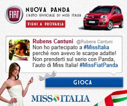 Tutti coloro che interagiranno con il banner potranno infatti inviare direttamente tramite il formato pubblicitario un tweet relativo al concorso di Miss Italia, interpretato con la chiave ironica: 'Non prenderti sul serio con Panda, l’auto di Miss Italia!'. Sarà in questo modo possibile inviare in tempo reale il proprio breve testo e condividerlo con i propri contatti, effettuando direttamente il log in nel caso in cui l’utente non sia già loggato durante la navigazione.