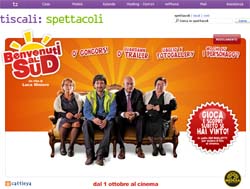 Medusa, con il contributo di Media Italia, ha scelto di affidare a Tiscali:ADV, la concessionaria pubblicitaria online del Gruppo Tiscali, la promozione web del nuovo film Benvenuti al Sud, nelle sale italiane dal 1 ottobre. Sul portale tiscali.it, nella sezione Cinema del canale Spettacoli, verrà realizzata una pagina dedicata e customizzata che conterrà photogallery, trama, la recensione, il trailer del film e un ritratto dei personaggi.Per l’occasione, Tiscali:ADV, in collaborazione con TBWA e Interzen, lancia dal 17 settembre un divertente gioco in modalità instant win ispirato al film. Infatti, su http://benvenutialsud.tiscali.it, in una versione interattiva del gioco delle tre carte, sarà possibile scegliere il proprio personaggio preferito e - indovinando la carta sotto cui si nasconde - si potrà vincere uno dei 200 biglietti digitali per vedere il film presso tutti i cinema aderenti al circuito http://www.iovadoalcinema.it/.