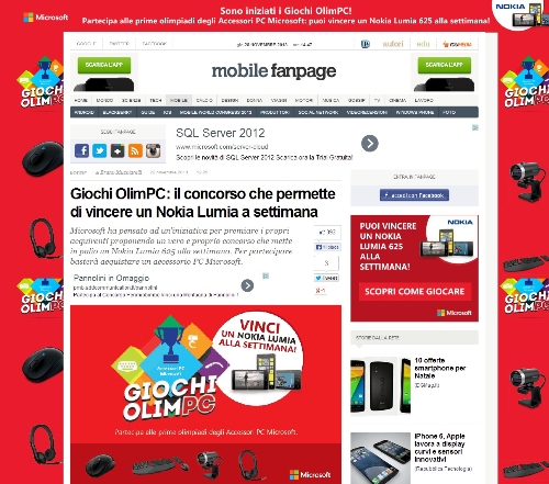 Dal 22 novembre è infatti online sulla sezione "mobile" di Fanpage.it, che conta circa 527.000 utenti unici certificati Audiweb, un pubbliredazionale che spiega le modalità di partecipazione al concorso e i prodotti Microsoft per PC coinvolti nella promozione.