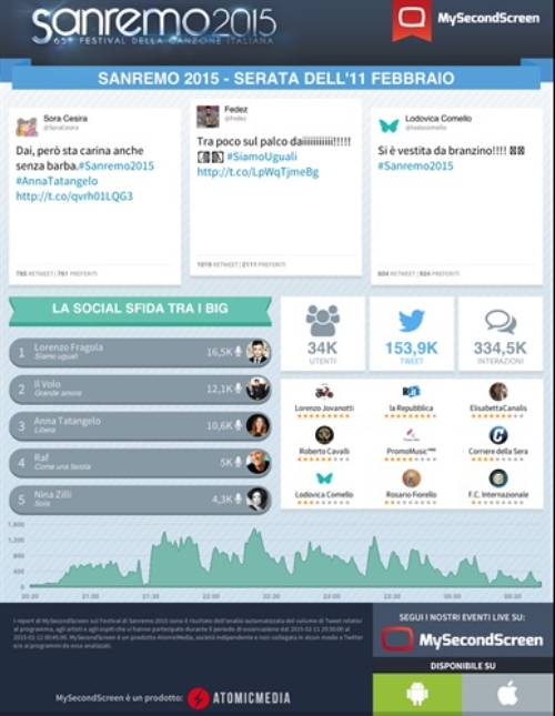 Questi i dati presentati nel report di MySecondScreen, il secondo schermo su smartphone per seguire in diretta il Festival di Sanremo. L’applicazione, sviluppata da Atomic Media e scaricabile gratis dall’Apple Store e da Google Play, nelle prime due giornate della manifestazione canora, ha infatti seguito in diretta i cantanti e le sfide che hanno catturato l’attenzione degli utenti di Twitter.