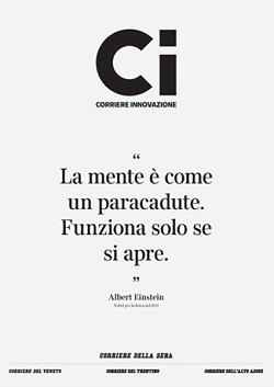 Corriere Innovazione promuove una nuova cultura dell’innovazione, che ne ampli i confini attualmente circoscritti al settore hi-tech, declinata in maniera trasversale attraverso tutti i temi e i settori: servizi, tecnologia, società, formazione, moda, design e architettura, turismo, enogastronomia, ambiente, industria chimica e meccanica, arte, medicina e salute. Nella copertina del primo numero campeggia una frase di Albert Einstein: 'La mente è come un paracadute. Funziona solo se si apre'.