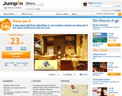 Dopo un periodo di test, Jumpin - attivo su internet (www.jumpin.it) e a breve sui principali device mobili - propone ogni giorno offerte speciali per il tempo libero scontate fino all’80%. Per usufruire delle offerte basta registrarsi, selezionare e acquistare l’offerta. Il coupon d’acquisto ricevuto dovrà poi essere presentato all’esercente.