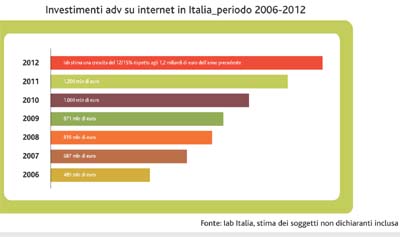Per dovere di cronaca, specifichiamo che il peso del web finisce con il ridimensionarsi bruscamente se, anziché basarci sulle stime Iab, ci si affida ai dati Nielsen, che non tengono conto dei ‘soggetti non dichiaranti’. In questo caso, infatti, internet si colloca, con i suoi 635 milioni di euro (dati Nielsen di chiusura del 2011, ndr), sul quarto gradino della classifica dei mezzi più scelti dagli inserzionisti, dietro alla televisione (4,6 miliardi di euro), ai quotidiani (1,3 miliardi) e ai periodici (799 milioni), ma prima del direct mail (515 milioni) e della radio (433 milioni). In ogni caso, dati Nielsen o stime Iab poco importa, il web rappresenta il mezzo giusto per aumentare il tasso di efficacia della propria comunicazione.