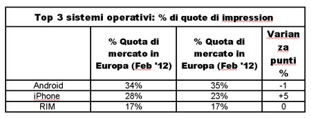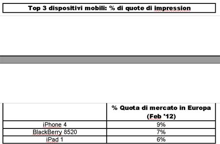Dal Mobile Insights Report relativo al mercato europeo emerge che Android continua a prevalere su iOS nel mercato europeo con il 34% delle impression. Il BlackBerry 8520 si conferma il secondo modello di cellulare più diffuso dopo iPhone 4.
