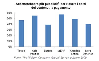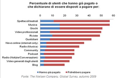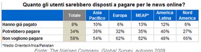 Dalla Global Survey Nielsen, condotta nell’autunno 2009 in 52 paesi, emerge che 1/3 degli intervistati potrebbe considerare l’idea di pagare per accedere ai siti dei principali quotidiani online, mentre il 58% afferma di essere contrario. Più è alto il valore assegnato al contenuto, più gli intervistati si sono dichiarati disposti a pagare. Il 47% si dichiara disposta ad accettare più adv per ridurre il costo.