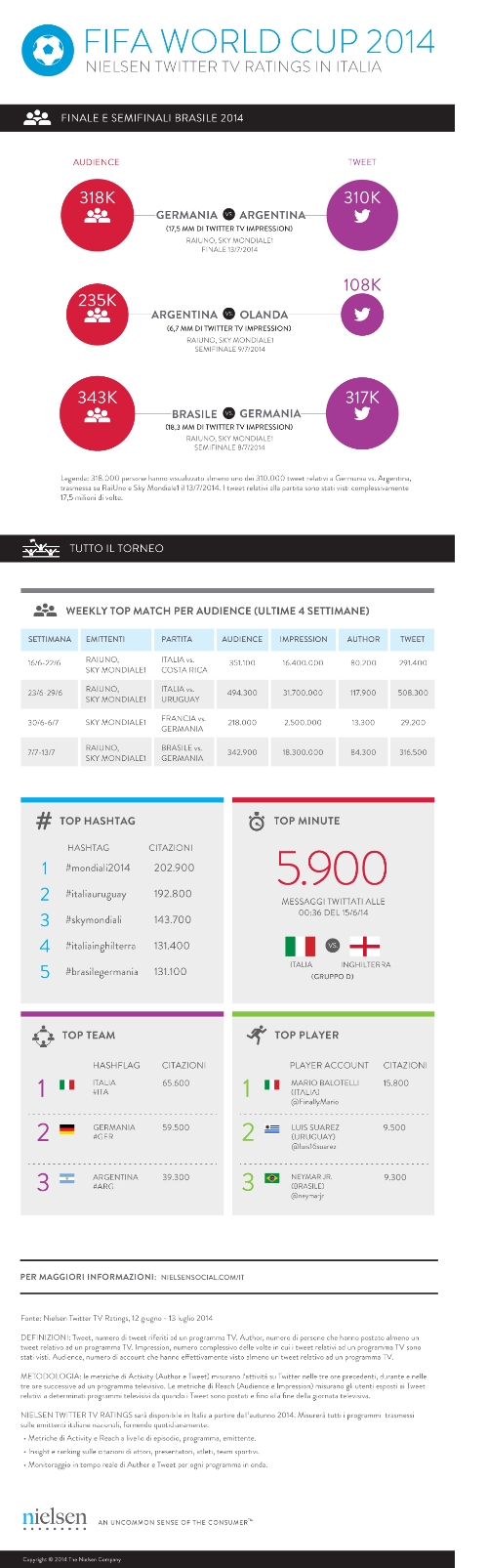 In attesa del lancio in Italia dello strumento di misurazione dei tweet relativi ai programmi tv, Nielsen ha diffuso i primi dati italiani di Activity e di Reach su Twitter misurati durante i Mondiali di Calcio in Brasile: 17,5 milioni di impression generate dai quasi 310 mila tweet postati sul celebre social network durante la finale trasmessa da Raiuno e Sky Mondiale1. Balotelli ha vinto la speciale classifica del giocatore con più citazioni tra gli utenti di Twitter con 15.800 tweet. Per quanto riguarda la nazionale italiana, la partita con il più alto numero di tweet è stata Italia - Uruguay, con oltre 508 mila tweet e un picco di 4.800 tweet alle 19:40.