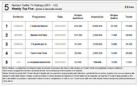 In base al numero di persone che hanno visto almeno un tweet riferito al programma (unique audience), in cima alla classifica c'è L’isola dei famosi di Canale 5 con 210.300 unique audience, seguita da Masterchef di Sky Uno, al primo posto la scorsa settimana, con 127.300 u.a. Al terzo posto C’è Posta per te di Canale 5, al quarto Forte Forte Forte di Rai 1 e al quinto Le invasioni barbariche di La 7, già in Top 5 nei giorni scorsi.
