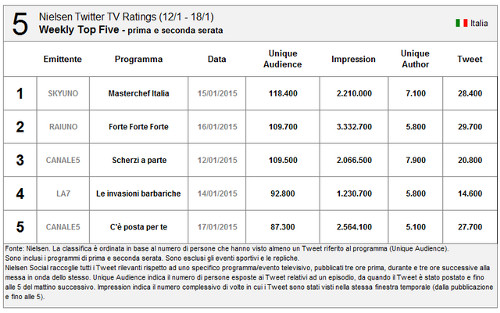 Nielsen ha pubblicato la top5 dei programmi televisivi di prima e seconda serata che hanno generato l’audience più ampia su Twitter nella settimana dal 12 al 18 gennaio 2015.