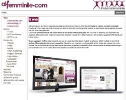 Alfemminile.com (www.alfemminile.com), il sito web dedicato al mondo femminile che conta quasi 5.000.000 di utenti unici mese e che rappresenta il Gruppo aufeminin nel nostro mercato, implementa il proprio minisito trade, uno spazio rivolto ad addetti ai lavori e operatori di settore per presentare in maniera sempre aggiornata la realtà di alfemminile.com in Italia e all’estero. Il minisito trade di alfemminile.com, accessibile al linkhttp://info.alfemminile.com, offre informazioni utili per comprendere il modello di business della società, il suo sviluppo sul mercato italiano dal 1998, le opportunità di comunicazione e il target di riferimento. La homepage del minisito è dedicata al Gruppo editoriale internazionale aufeminin, di cui alfemminile.com fa parte, e mette a disposizione informazioni societarie per gli stakeholder e dati di traffico utili a centri media, agenzie e inserzionisti.