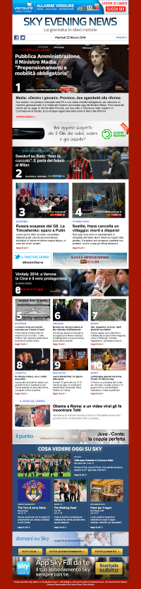 La raccolta della testata, che si può ricevere registrandosi su www.sky.it/eveningnews, è curata da Web System.