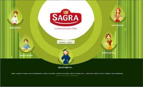 Il sito si apre con 'la passione per l’olio', pay off di Sagra: l’olio per Sagra è un valore ed è sinonimo di dedizione, ricerca e cultura. Tutto il sito segue questa ispirazione e si svela al navigatore con immagini del mondo Sagra che, da sempre, parla attraverso la qualità e la genuinità dei suoi prodotti.