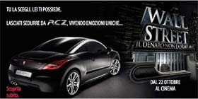 Peugeot Italia e 20th Century Fox hanno siglato un’importante partnership grazie alla quale sarà possibile vivere le emozioni del grande cinema in anteprima.Collegandosi al mini sito dedicato www.rczemozioneunica.it e compilando il format di registrazione ogni utente avrà la possibilità di lasciare un messaggio a RCZ di massimo 140 caratteri entro il 13 ottobre 2010. Il giorno 14 ottobre 2010 verranno estratti i nominativi dei 260 autori dei messaggi più accattivanti che riceveranno i biglietti - validi per 2 persone - per diventare gli ospiti d’onore dell’anteprima del film - Wall Street: Il denaro non dorme mai- che si terrà il giorno 18 ottobre 2010. Saranno estratti 130 nominativi per l’anteprima di Milano e 130 per quella di Roma.