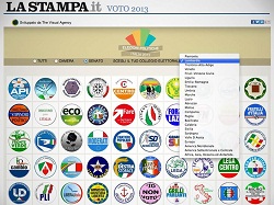 Le Elezioni Politiche 2013 sono alle porte e non è semplice recuperare tutte le informazioni necessarie e arrivare alle urne preparati. grazie alla collaborazione tra La Stampa.it e The Visual Agency, l’agenzia milanese specializzata in Data Visualization e Visual Explanation, gli elettori hanno a disposizione un nuovo strumento online per orientarsi nella moltitudine di simboli elettorali. All’interno dello Speciale Elezioni realizzato dal quotidiano torinese, infatti, gli utenti posso accedere con un click all’applicazione infografica 'Scopri i simboli e i siti dei partiti della tua circoscrizione' che consente di visualizzare gli oltre 180 simboli elettorali che partecipano alle elezioni, fare una ricerca per ciascuna circoscrizione elettorale e suddividerli per Camera e Senato. Scorrendo su ogni simbolo, inoltre, è possibile accedere al sito web del partito e al relativo programma elettorale.